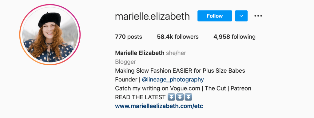 Marielle Elizabeth has written for Vogue and is a photographer. She is an advocate for size inclusivity, as well as slow fashion. Her content provides her followers with recommendations of good plus size clothing, while also being sustainable.