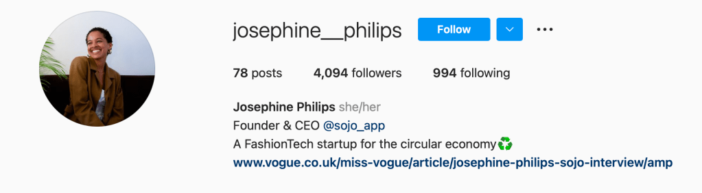 Josephine Philips is 23 years old and has already been featured in British Vogue. She launched Sojo, an e-commerce application. Sojo happens to be United Kingdom’s first app that handles clothing repairs online. The Instagram for Sojo (as well as her personal Insta) informs their followers about sustainability. Philips wants to be a part of a greener future, and her platform serves as an easy, accessible way to get clothes fixed, rather than to throw it out.